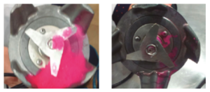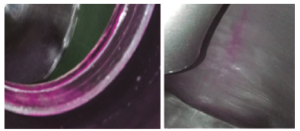 De delen van het circuit werden gedemonteerd en getest op biofilms met behulp van de TBF® 300 biofilmdetectietest. Er verscheen onmiddellijk een aanhoudende fuchsia verkleuring in specifieke aansluitingen en bochten. Dit wijst op de aanwezigheid van een biofilmmatrix en bevestigt een broeihaard van micro-organismen.