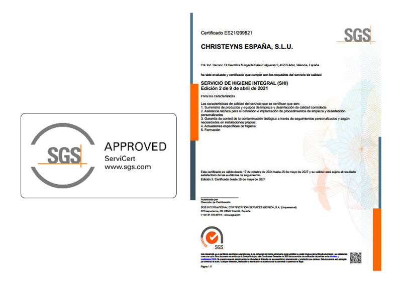 El Servicio de Higiene Integral certificado por SGS está diseñado como una herramienta de seguimiento y control que contribuye a mejorar la eficacia de los procesos de higiene. Cubre todas las áreas y factores implicados con limpieza y desinfección de las instalaciones de producción y manipulación de alimentos.
