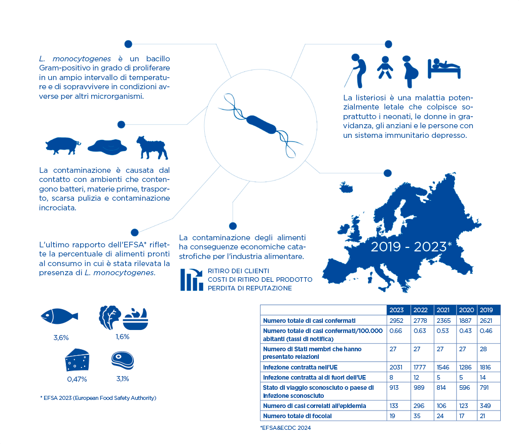 Una delle maggiori sfide che le industrie alimentari affrontano è rappresentata dalla possibile contaminazione da Listeria monocytogenes, la quale potrebbe comportare perdite finanziarie fino a 10 milioni di euro in caso di richiamo di prodotti. I cibi maggiormente a rischio sono quelli pronti al consumo, privi di trattamenti termici aggiuntivi, come salsicce, salmone, insaccati e formaggi. Per mitigare il rischio di contaminazione da Listeria, il servizio Listeria Defense offre alle industrie le competenze e gli strumenti essenziali per la prevenzione.